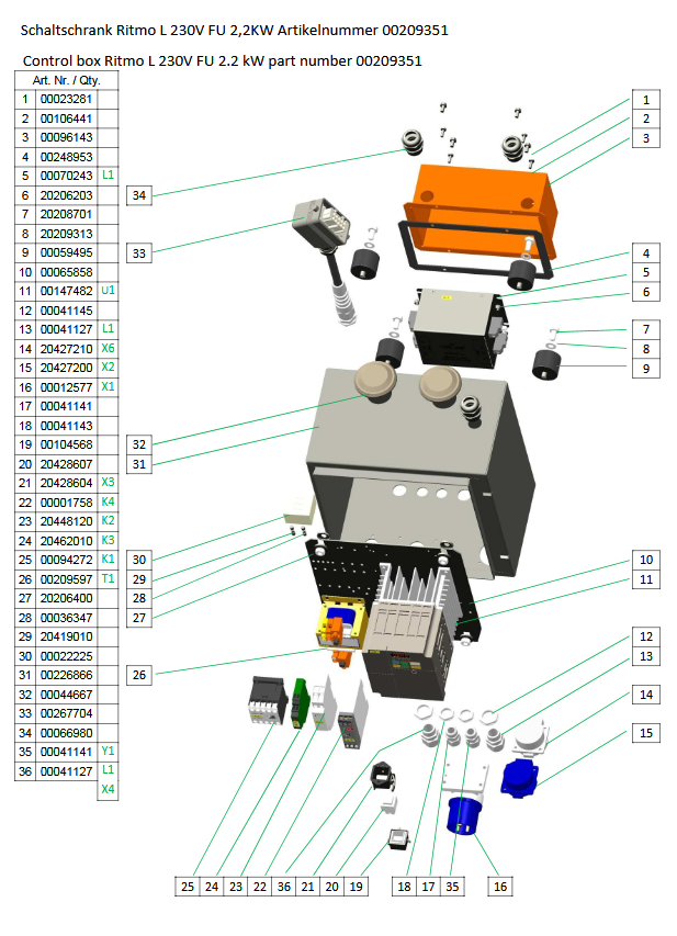 Ersatzteilliste Schaltschrank Ritmo L 230V FU 2,2KW Artikelnummer 00209351: